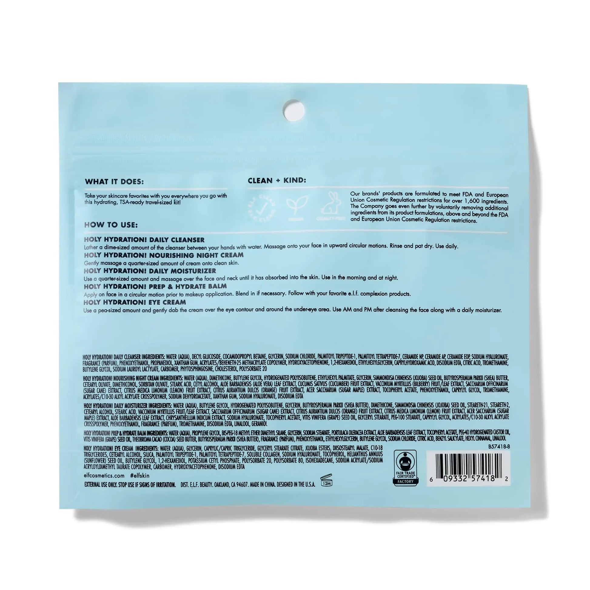 What it is: Five hydrating skincare favorites packed in one travel-sized kit. Why we love: A complete skincare routine in one kit TSA-friendly sizes Moisturizing, vitamin-infused formulas Key Ingredients: Citric Acid - Gently exfoliates and evens skin tone Cucumber Extract - Calms skin and reduces puffiness Shea Butter - Nourishes and softens skin Aloe Vera - Soothes and provides anti-inflammatory benefits Jojoba Oil - Locks in moisture Vitamin E - Brings a refreshing moisture boost A skincare routine that’s ready to go where you are! This convenient travel-sized kit includes five moisturizing skincare faves that will deeply nourish, brighten, and soothe all skin types. Each product packs a punch and is infused with skin-quenching ingredients that will hydrate your skin from the inside out. Kit includes: Daily Face Cleanser (30ml) - A gentle daily cleanser infused with Citric Acid that removes dirt, impurities, and makeup while brightening skin. Prep and Hydrate Balm (6g) - A water-based balm stick that instantly hydrates, improves skin texture, and preps skin for makeup application. Daily Hydration Moisturizer (25 ml) - A lightweight cream moisturizer infused with essential nutrients to deeply nourish the skin. Nourishing Night Cream (15g) - A soothing and calming cream that revitalizes the skin overnight. Illuminating Eye Cream (7g) - A rich and nourishing eye cream that reawakens your delicate eye area. All e.l.f. products are made from skin-loving ingredients you want, minus the toxins you don’t—all at good-for-you prices. All e.l.f. products are 100% vegan, cruelty- free, and leaping bunny certified. Because kindness is chic. "